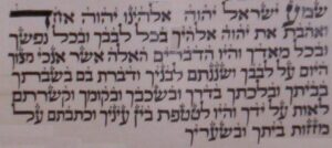 The picture shown here is of Deuteronomy 6:4-9. The last letters of the Hebrew words shema (“Hear”) and echad (“one”) were often written large, as here, to express the importance of the sentence, “Hear, O Israel, YHWH our God, YHWH one.”